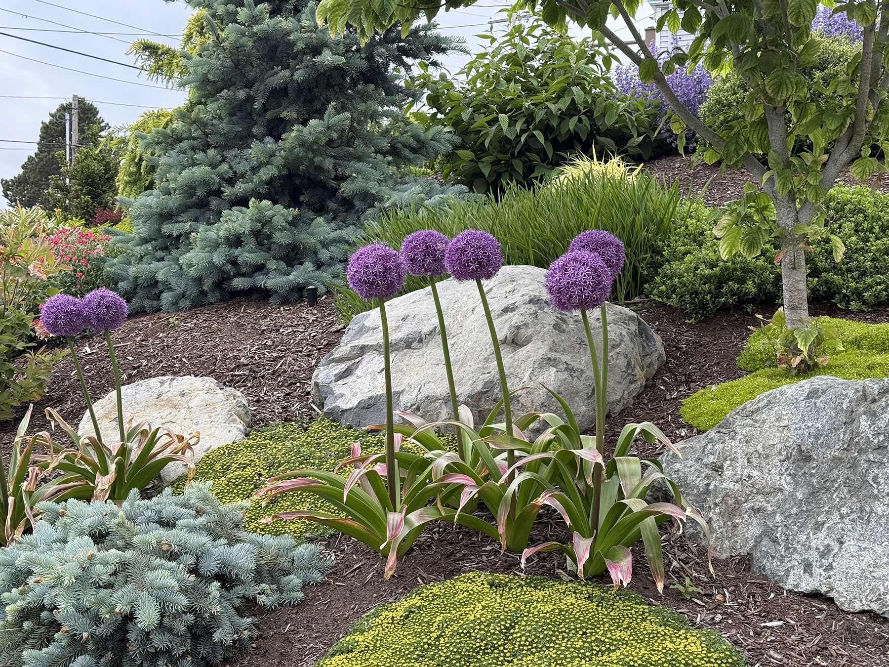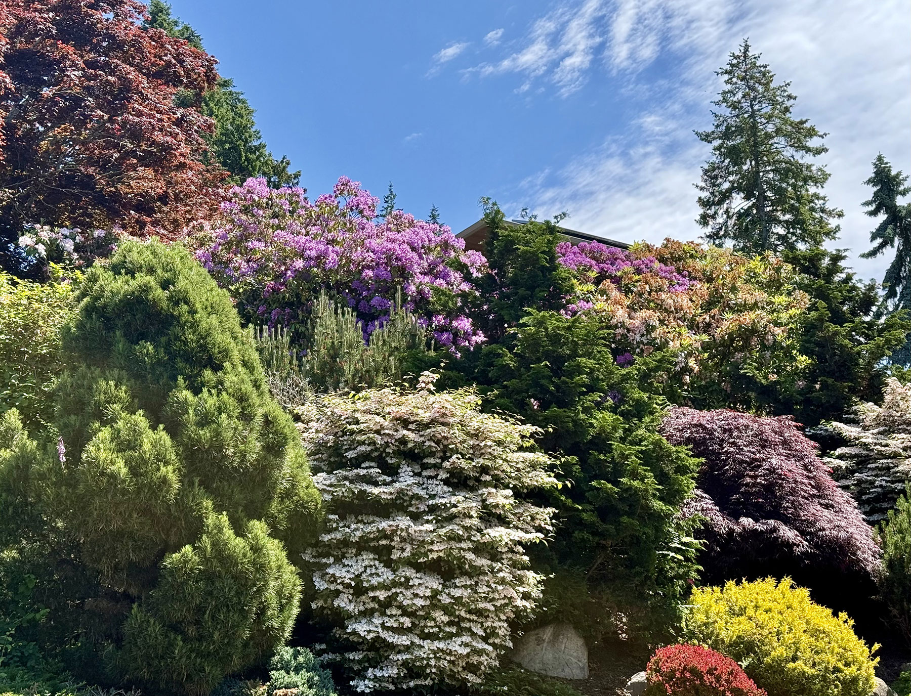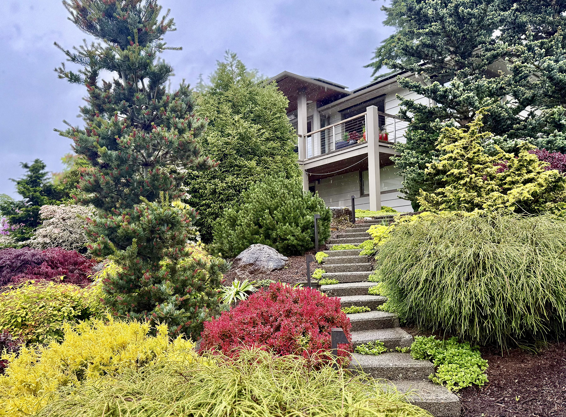 - A colorful textured garden anchored by evergreens, ground covers and maples