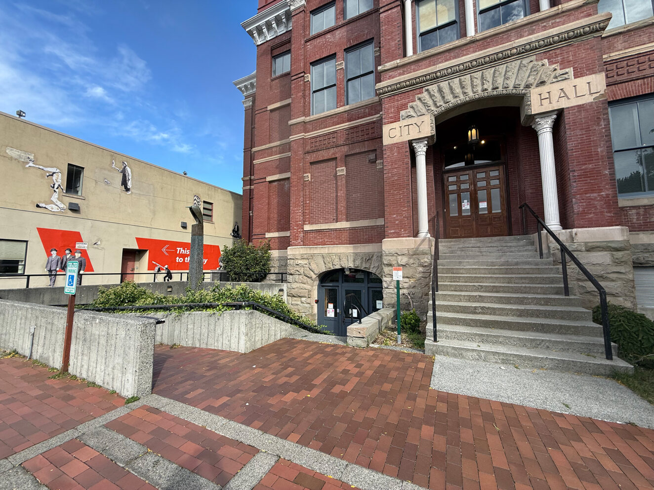 For additional assistance entering Old City Hall, call the front attendant desk at 360.778.8977. An elevator is located on the basement level that accesses all levels of the building. An accessible/family restroom is located on the first floor of the building.